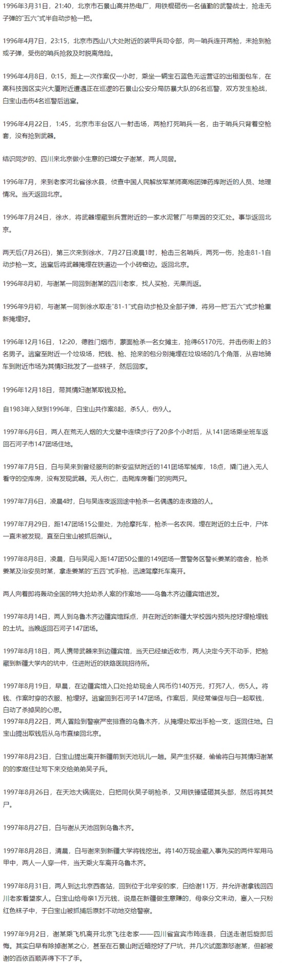 自1996年3月因为盗窃罪刑满释放,到1997年9月他在家中落网,在这短短的一年半的时间里,白宝山袭警、射杀哨兵抢枪、杀人抢钱,曾在北京、河北、新疆等地作案多起,累计抢枪3支,先后打死无辜群众15人,抢劫人民币140多万元,并在狱中先后杀害2人。这个案件被列为1997年中国十大案件之首,被国际刑警组织列为1997世界第三要案,震惊世界。