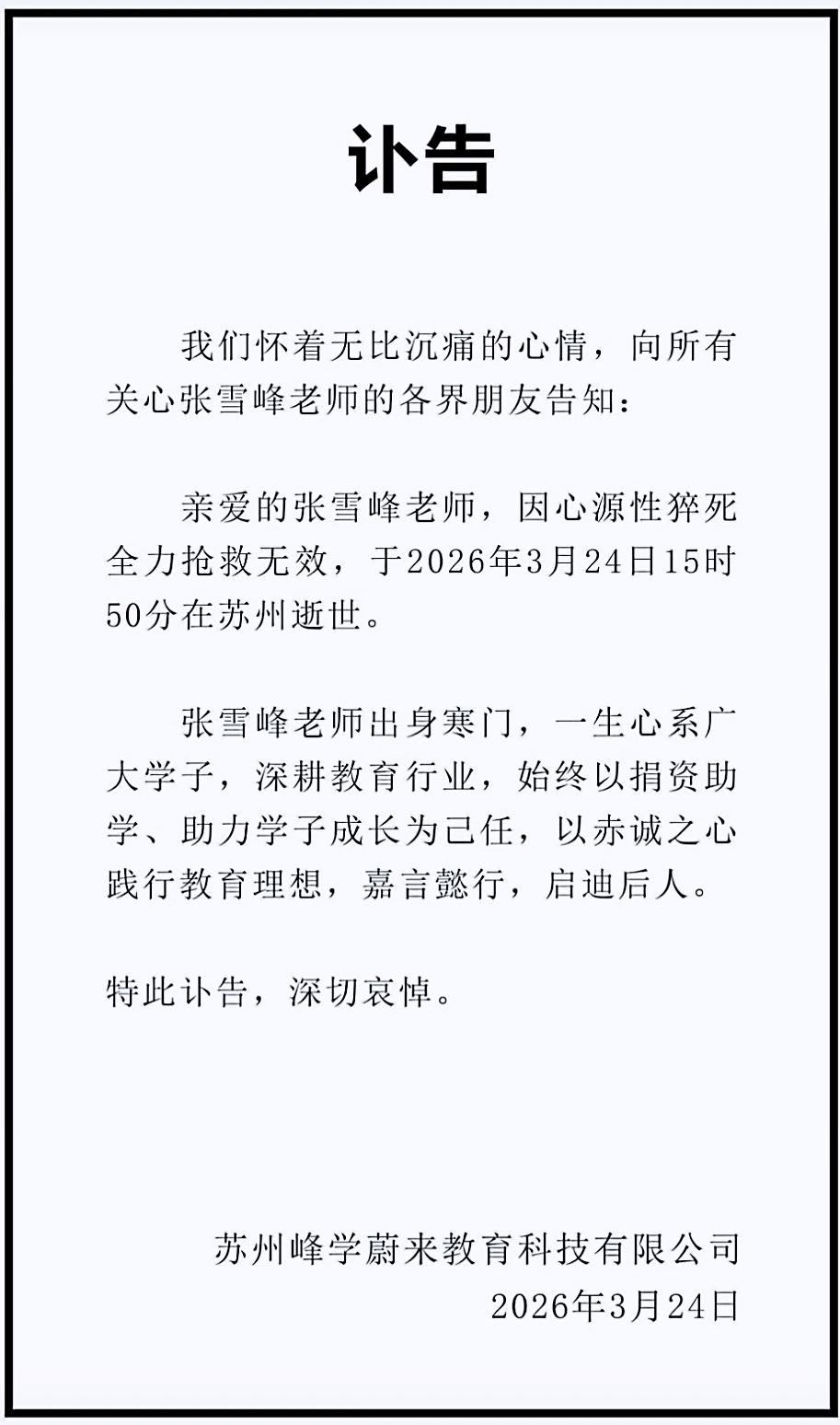 2026年3月24日,一则令人扼腕的消息席卷全网。当晚21时47分,苏州峰学蔚来教育科技有限公司正式发布讣告,知名教育博主、考研规划导师张雪峰因突发心源性猝死,经全力抢救无效,于当日15时50分在苏州不幸逝世,年仅41岁。