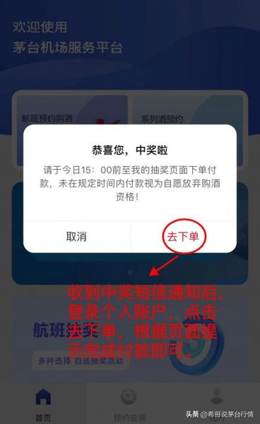 (六)酒款支付:中奖旅客须在中奖当日15:00之前通过茅台机场APP或茅台机场微信公众号根据提示完成酒款支付,逾期未完成支付的视为自动放弃购酒资格。