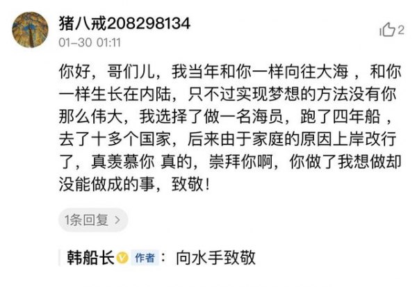 有人在评论中说,自己年轻的时候也曾做过水手,热爱大海,但是后来因为生活而选择改行。羡慕并崇拜韩船长,认为他做了自己想做而没能做到的事。