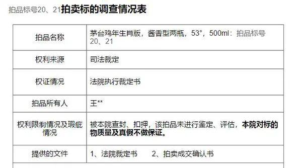 当月,徐州铜山区法院变卖了200箱尊王酒(蓝),标的物介绍部分称,有意者请实地看样,由于该批标的物存放时间较长,可能存在挥发现象;该标的物按现状拍卖,按现状交付,若参拍则视为对拍品所有瑕疵均详细了解并接受;买受人对拍卖标的如需用于生产、使用或销售的,须按照国家相关规定进行,擅自用于生产、使用或销售而造成的一切后果均由买受人承担。成交后,法院仅出具成交确认书,无法提供原始货物相关发票。并附特别说明,“本院对拍卖标的物所作的说明和提供的图片等,仅供竞买人参考,不构成对标的物的任何担保。标的物以实物现状为准,法院不承担拍卖标的瑕疵保证”。