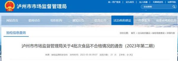 中国质量新闻网讯 5月6日,四川省泸州市市场监管局网站发布关于4批次食品不合格情况的通告(2023年第二期)。通告称,经四川国检检测有限责任公司检验,抽取酒类、粮食加工品、蔬菜制品等9个食品大类104批次产品,检出4批次样品不合格。发现的主要问题是食品添加剂超范围超限量使用和质量指标不达标。