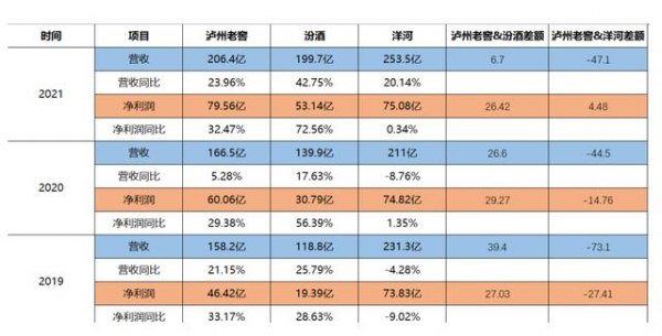 然而到了2021年,随着洋河恢复增长,这一趋势发生变化。根据2021年年报,泸州老窖营收206.4亿元,洋河股份为253.5亿元。二者的差额再次扩大到47.1亿元。