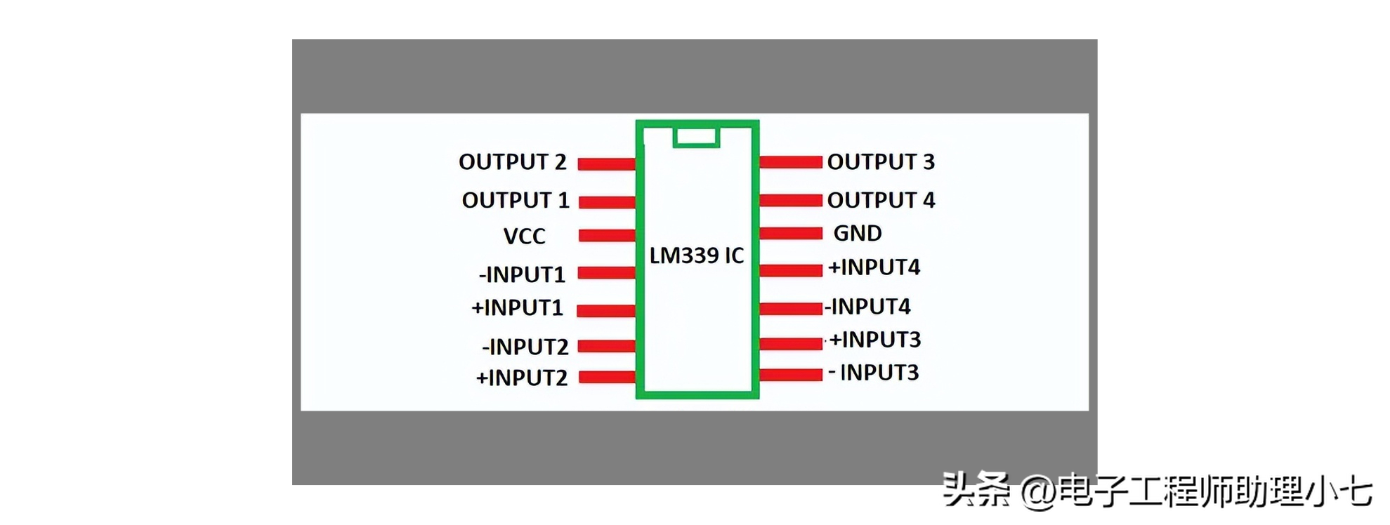 LM339 比较器 IC 由 4 个内置的独立电压比较器组成,下图为 LM339 管脚图: