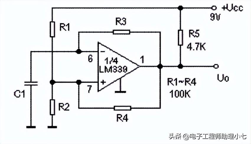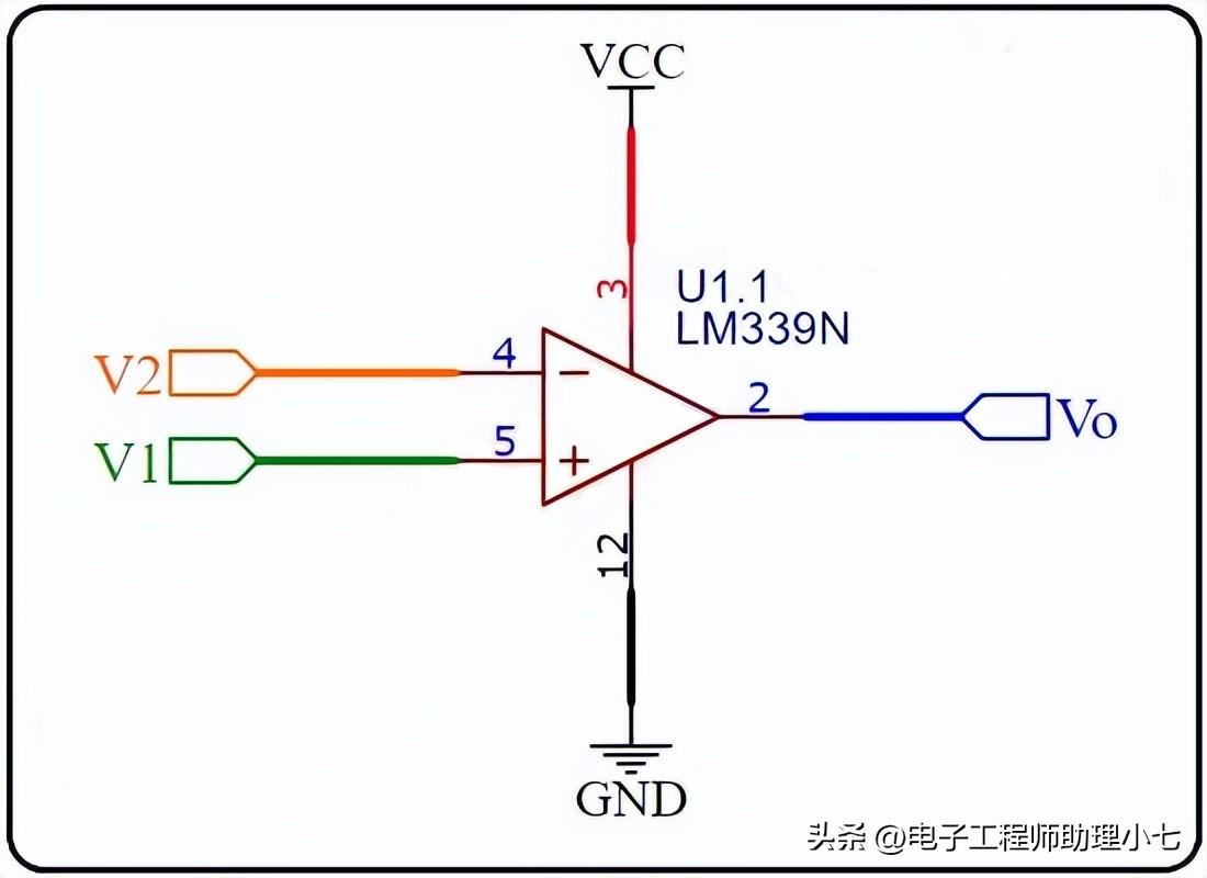 这里电路中两个电压的比较可以通过 LM339 来完成,输出为 V0,电路由单电源 VCC供电。两个电压之间的比较可以基于以下条件进行。