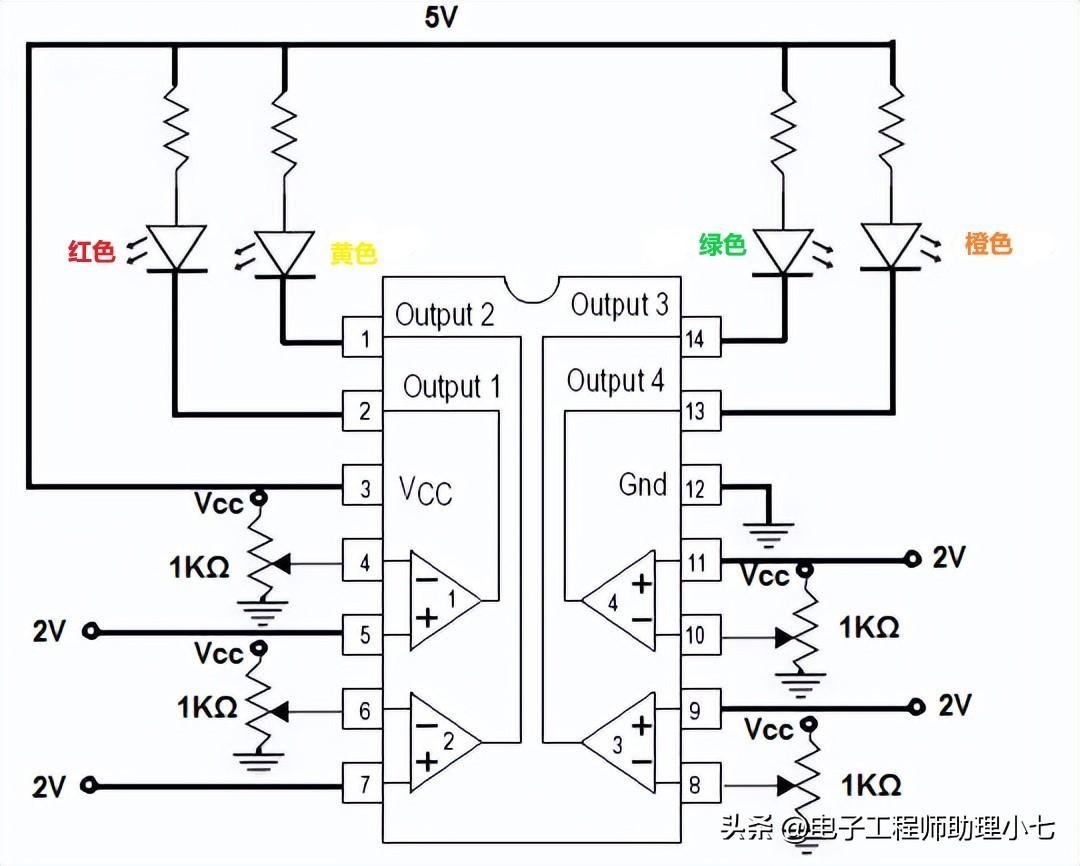 在这个电路中,有 4 个不同颜色的 LED。对于运算放大器的每个反相端子,我们连接了电位器的抽头端子,电位器的一端接 Vcc,另一端接地,然后将 +2V 电源连接到运算放大器的每个同相端子。