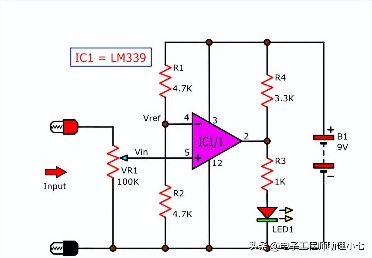 这个电路实际上只是为了演示才构建,主要目的还是为了更加明了地展示 如何连接 LM339 以及 LM339是怎么工作的。
