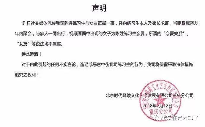 公司声明粉丝信,结果到传说中的出道选拔团综“登陆”前,去年6月,又有网友爆出陈玺达的恋爱全纪录