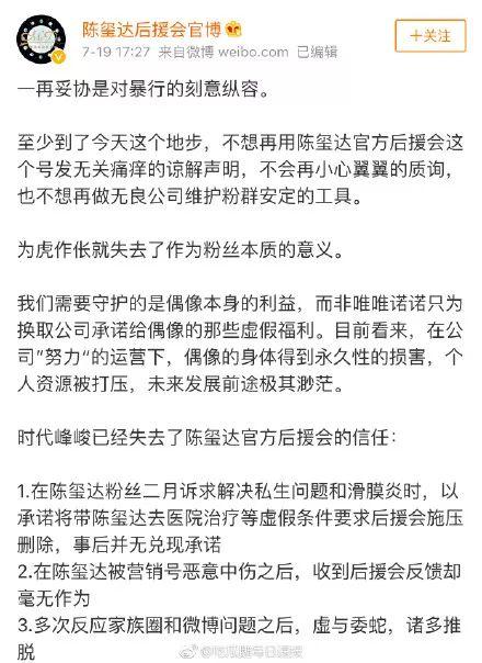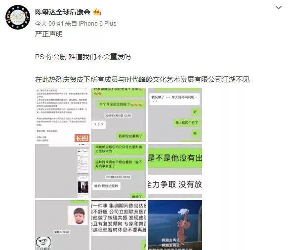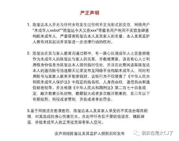 陈玺达后援会则表示,网上流传的流言都是针对陈玺达精心设计的,甚至用到了“诱拐”这个词。