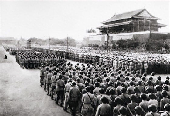 在这样的背景情况下,这五百名战士自然没有事先接受过仪仗队的专门训练,专用制服之类就更不可能了。他们有的,是昂扬向上的精神面貌、接到任务立马投入二十多天苦练的执行力,和手中清一色从日本侵略者手里缴来的“三八大盖”。
