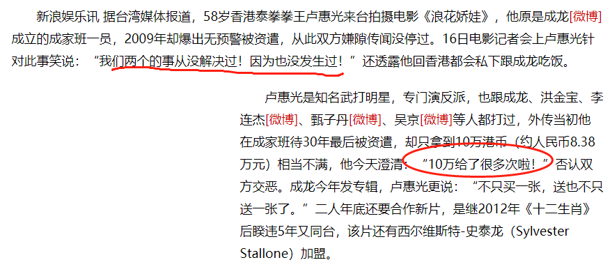 “成家班卢惠光指责成龙无情无义,辞退费只给了10万块。”