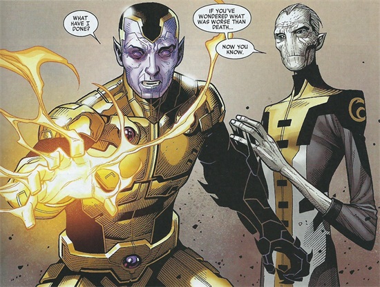 在乌木喉的诱劝下,辛恩决心“接受自己的命运”,没有逃走,而是用自己的力量打倒了灭霸。辛恩把灭霸和黑暗教团里仅剩的一个忠臣暗夜比邻星一起封入类似琥珀的存在中,让他们陷入“活死人”状态,乌木喉的确是一个阴险的人物。