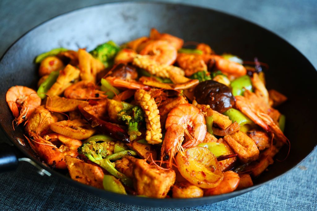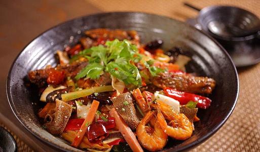 麻辣香锅,主材料选用虾、蟹、田鸡、肥肠等,配上野山菌、青笋、腐竹、土豆等素菜,炒岀麻辣鲜香味道,虾鲜、肠脆、肉嫩、笋片清香,腐竹可以吸收各种肉类和海鲜的鲜味,加上本身的香味,混合起来,成就了“一锅香”。内容混搭有荤、有素、有淡、有辣而自然形成,也有人为加工,看上去已觉天南地北的食材,融入锅,就如时尚界将五颜六色混搭一起样,享受的是丰富与多彩。