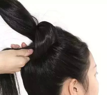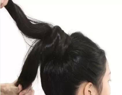 STEP4:再从马尾中取出一束等量的头发,沿着已经绕好的发圈缠绕,同样稍微用力,缠绕到发尾用发卡固定住。