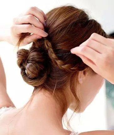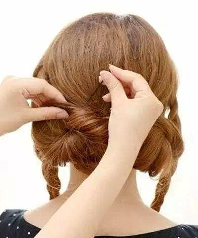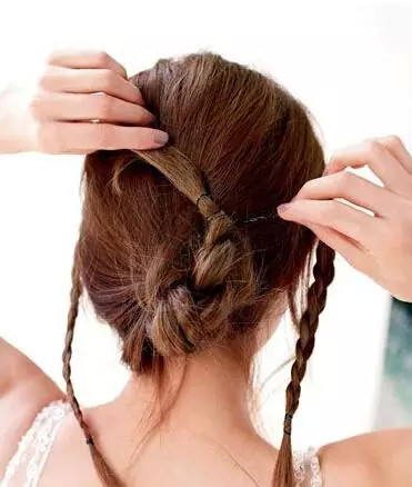 第三步:将两侧的细发辫分别在中间发髻的上方和下方,环绕发髻用发卡固定。