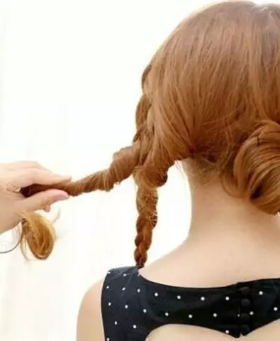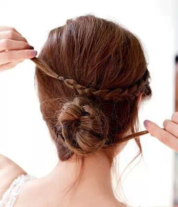 第二步:将中间的发辫逆时针拧转成发髻后,用发卡固定。注意在拧转的时候不要太紧,尽量保持发辫的松散感。