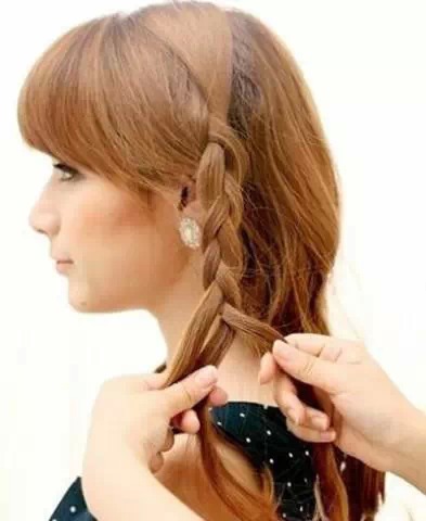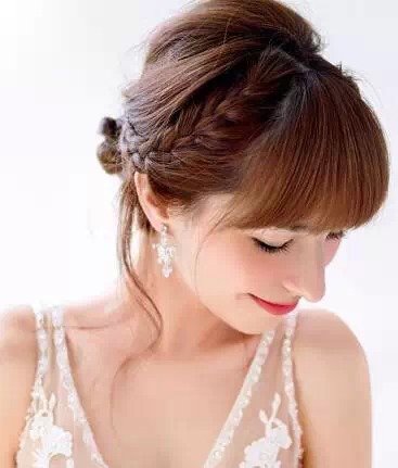 发辫与松散发丝的结合才能打造出轻松感,两侧抽出少量发丝,用齐刘海塑造温婉味道!