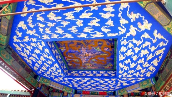 (4)故宫博物院内重华宫东侧的漱芳斋,大戏台上华丽的藻井。图案都是祥云缭绕,蝙蝠飞翔。中间盘踞着俩条祥龙。