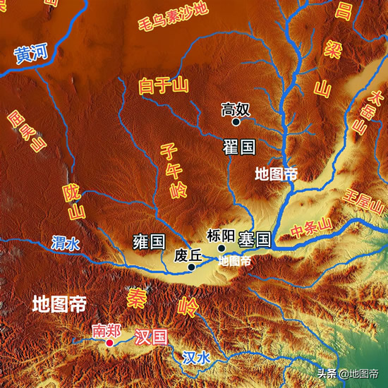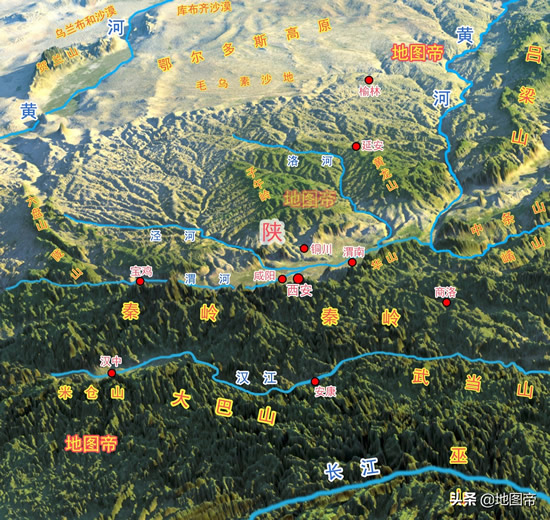 陕西省整体地形,高原、平原、山脉层次分明,从北往南依次是陕北高原、关中平原、秦岭、汉中盆地、大巴山脉。