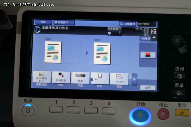 全部设置完成后,屏幕上会根据所选选项显示预览,确认无误后点击操控面板上的“开始”按键,复合机设备就会自动开始扫描复印流程。