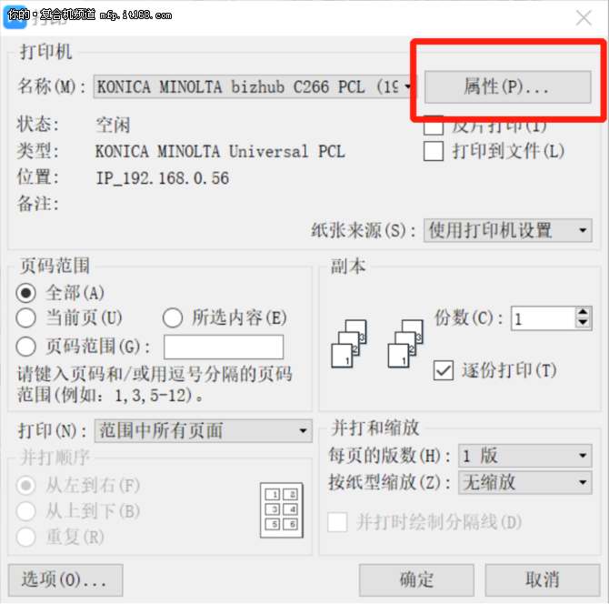 点击之后会进入页面设置选项。在该界面下可以设置基本的打印页面信息,也可以点击打印机右侧的“属性”按钮进行进一步的设置。