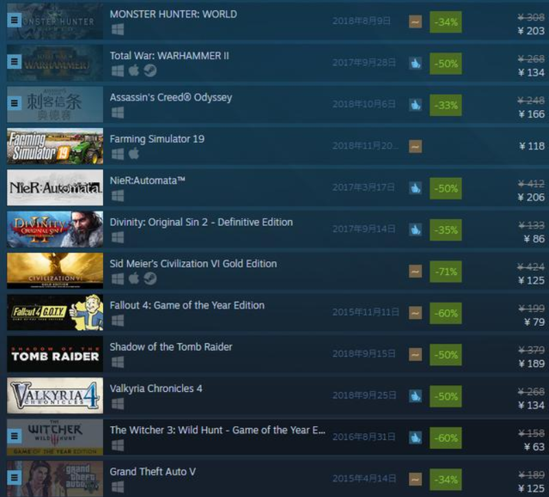 此外,这次参与打折的游戏还有《怪物猎人世界》 -34% 203元,《战锤全面战争2》 134元,《孤岛惊魂5》 -50% 124元,《NBA 2K19》 -50% 99元,《尼尔:机械纪元》 -50% 206元,《神界原罪2》 -35% 86元等等,是不是非常心动呢?