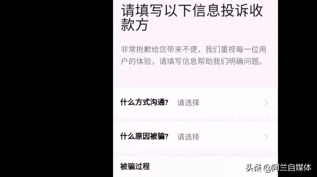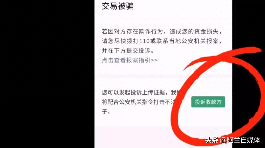 我们选择一下,比如说我遇到的是“交易被骗”,我们就把“交易被骗”这个项目后面的箭头点开,上方有提示,“若因对方存在欺诈行为造成您的资金损失,请你尽快拨打110或联系当地公安机关报案,并在下方提交投诉”,我们点开下方的“投诉收款方”。