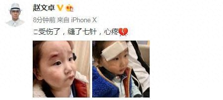 4月4日赵文卓在网上分享了女儿的照片,表示女儿受伤了,缝了七针,心疼,画面中的小姑娘就是赵文卓的三岁女儿,可以看到眉毛部位有一道比较长的伤口,还有包扎好的效果图,小姑娘咬着嘴唇眼含眼泪让人非常心疼。