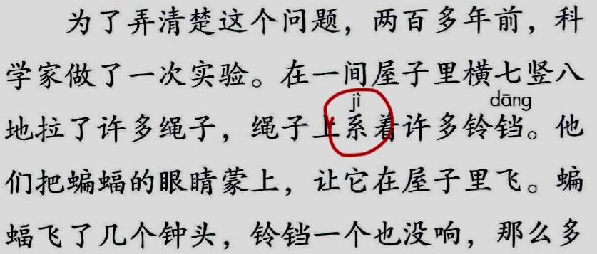 部编版语文教材四年级上册《蝙蝠和雷达》一课中,有这样一句话:在一间屋子里横七竖八地拉了许多绳子,绳子上系着许多铃铛。这里的“系”课本中注音是“jì”。