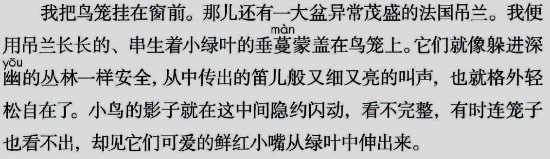 在部编语文五年上册《珍珠鸟》一课中,有这样一句话:我便用吊兰长长的、串生着小绿叶的垂蔓蒙盖在鸟笼上。这里的“蔓”课本中注音是man