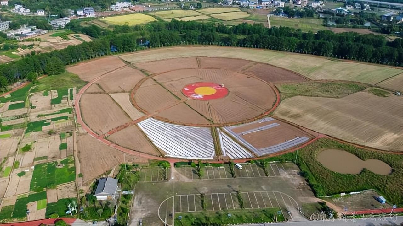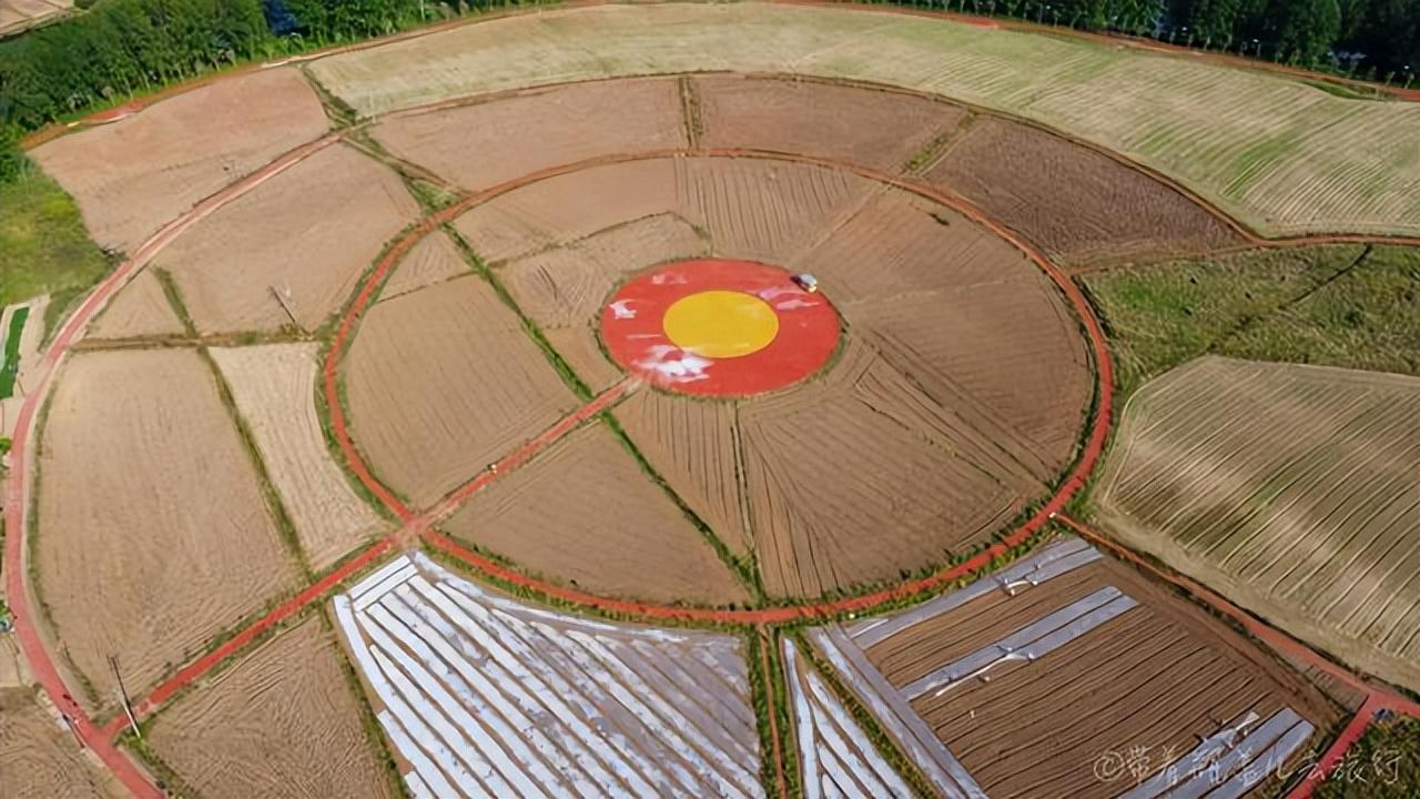 陈抟故里景区,位于潼南区崇龛镇,距离双江古镇大佛寺也并不很远,差不多十来公里的样子,初秋的时节,这里早已没有了油菜花的影子,偌大的旷野中,略微显得有些凋敝,但是哪个巨幅的太极八卦图框架还在,只是此刻不再是一片金黄,而是一些红色的花朵,听说是玫瑰,但距离太远,我也只能在无人机上俯视一番!