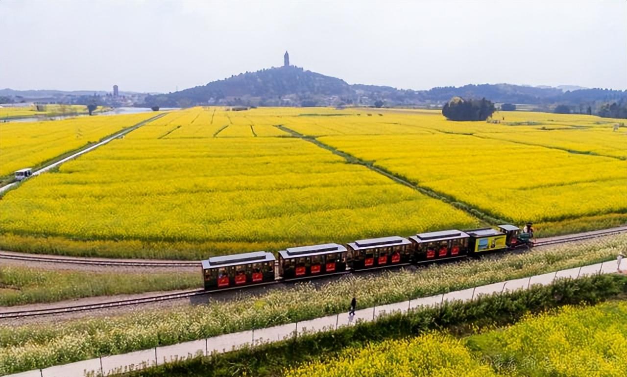 潼南的油菜花实在是太壮观了,3万多亩油菜基地,每年春天到了花开的季节,那真是“七彩花海,流金大地”,把整个潼南都染成了一片金色,而且这里还把菜花打造成各种图案,比如这个中国最大油菜花太极八卦图,黄色、紫色等错落搭配,蔚为壮观,美不胜收,花丛之间,河道纵横,偶尔还有开往春天里的小火车,真的是太美了,所以春天的时候,这里吸引了非常多的主城居民前来赏花打卡!