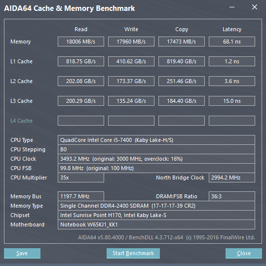 K680E的处理器是i5-7400,比上一代同定位的6400高了0.2GHz的频率,比同一代的移动版型号7300HQ频率也高了0.2GHz。综合跑分上,7400是这些i5中跑分最高的,但还是比i7差了一截,此外由于测试机是单通道,物理分数也受到牵制,幅度没有达到预期值。