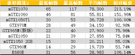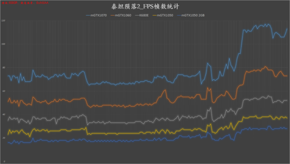 在第一代受到不断好评后,泰坦陨落推出了第二部作品,全平台同时发布。这部新作对显卡的要求主要在与显存上,最高画质下4G显存很可能会不够用,这还仅是1080P的。K680E在最高特效下有40帧平均,流畅度不行,勉强能够玩,建议降低特效提高流畅性。帧数表现上,K680E比M1050高了39.9%,比M1060低了30.2%,比公版M1050Ti高了2帧多点。
