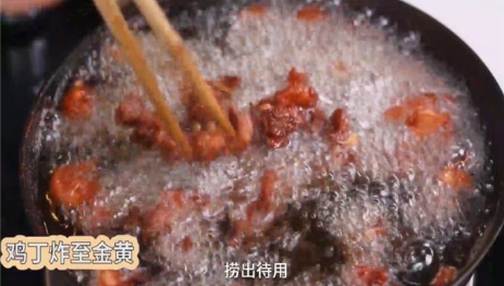 2.油温烧至6成热,放入鸡丁炸至金黄,捞出待用。