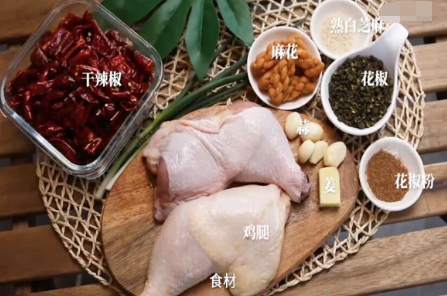 食材:鸡腿400克,麻花50克,姜1块,蒜5瓣,小葱2根,干辣椒30克,花椒5克,花椒粉2克,熟白芝麻2克