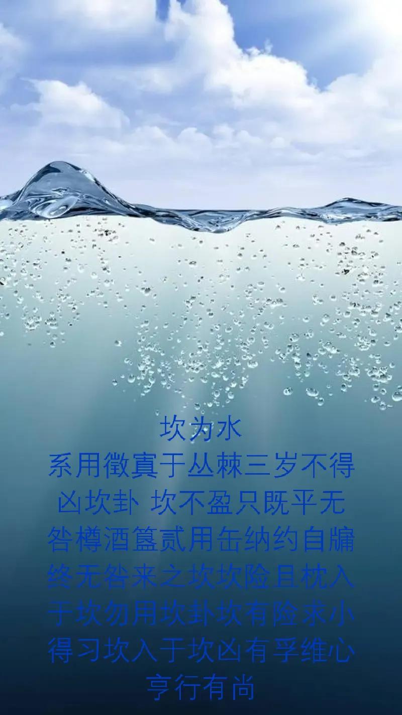 坎为水:坎卦为二坎相重,阳陷阴中,险陷之意,险上加险,重重险难,天险,地险。险阳失道,渊深不测,水道弯曲,人生历程曲折坎坷。绝颠聪明,“心诚行有功”。比和卦,谋事顺畅可成,但内中有波折。肾,泌尿系统疾病,血病,妇科病,视力差,心脏病。坎为永,水长流不滞,是坎卦的卦象。君子观此卦象,从而尊尚德行,取法于细水长流之象,学习教化人民的方法。两水重叠,坎水为险,进固险,退亦险,进退两难。危机重重,宜沉著应付,保持心境开朗,凡事莫与人争。坎为水坎卦一阳处上下两阴之中,阳刚被阴柔围困,故为陷为溺;坎之用为中间一阳,阳主动,但坎之动必在四周包围的环境中;水必依四周之包围才能成形稳定,以围合为体、以动为用,故坎为水。水,平度的标准。在五行中,水代表北方的属性。字形像众水同流,藏在水中的微阳气息。山水中的水,是指江河湖海。