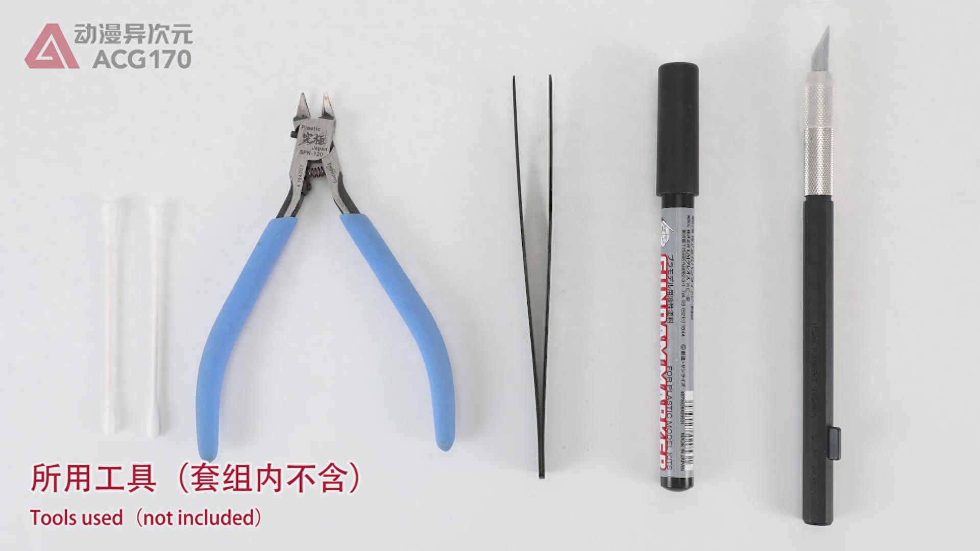 拼装用到的工具,依次是剪钳、镊子、笔刀