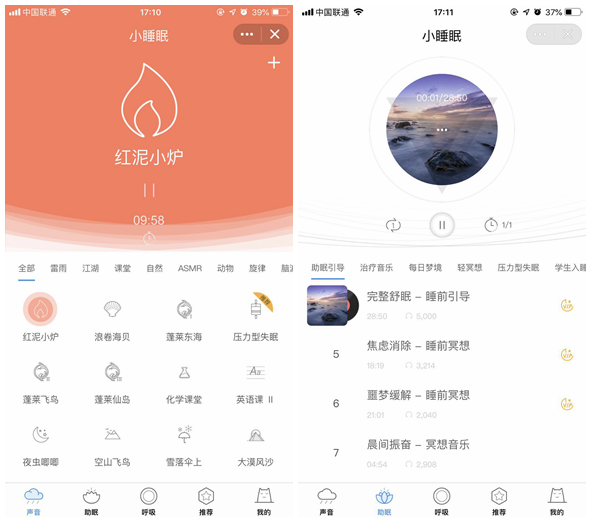 一款兼具实用性和颜值的小程序。小睡眠里面的音频非常多,风声、雨声是标配的白噪音,可以助眠,提高专注。还有呼吸技巧、专业助眠的音频,而且界面的颜值非常高,操作也相对简单方便。