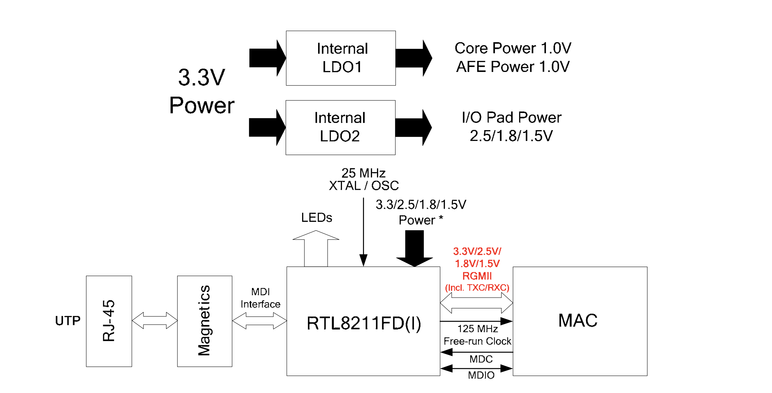 它的引脚会直接引入到我们的RJ45接口上面,甚至网卡接口上的LED灯也是这个芯片提供的闪烁信号。