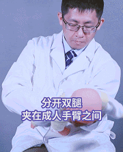 用手托住婴儿的头部,将孩子翻转为脸部朝下,使孩子趴在我们的胳膊上,我们的胳膊放在大腿上。