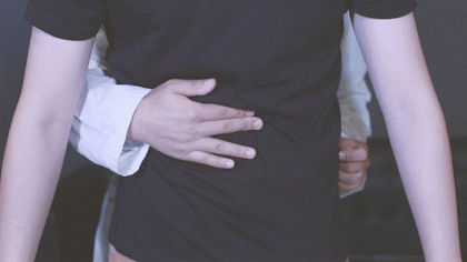 搂住病人腰部,找到肚脐上方两指处,右手握拳,虎口对准该处。左手抓住右手,两只手从下往斜上方冲击腹部。