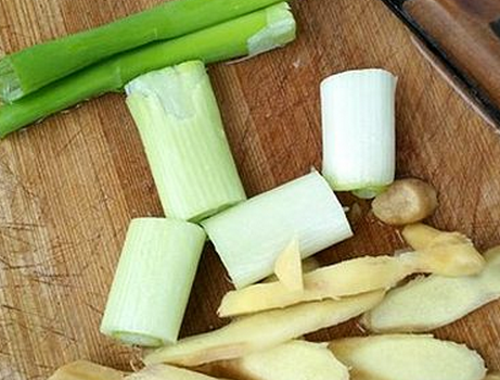 第二步,大葱洗净后,切成片,生姜切成片,将所有的调料放在调料盒中用;