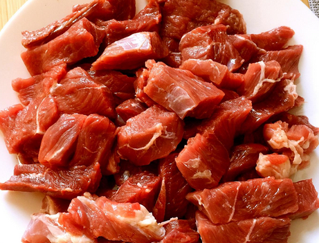 制作过程:第一步,首先将猪腱子肉用清水冲洗干净后,切成比较大点的块,沥干水分;