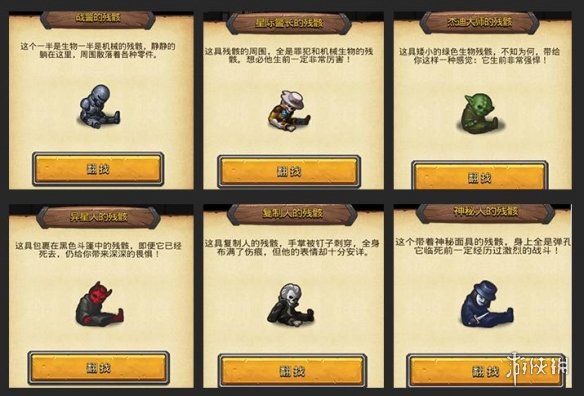 当然…《不思议迷宫》的开发团队也和开发“受苦”游戏的制作者一样,热衷在游戏里加入一些之前在旅途中倒下的冒险者来为旅途添加必要的“趣味”。随机事件不一定总是好事,也不一定是坏事,有时候敲开后会是一具具残骸。除了能翻找一番获得他们身上的物品外,还会有一小段介绍文字……emmmm,连他都倒在这里了吗?