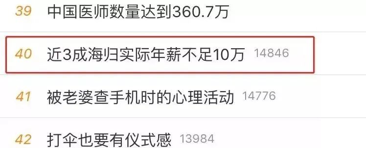 同时,有海归薪酬报告显示,44.8%的海归税后收入达不到6000元/月,43%的海归薪资水平低于预期。