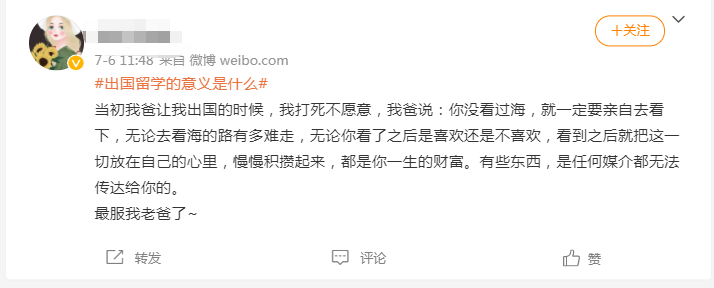留学投资的是个人,绝对不是说一毕业就能挣多少钱。有些人希望通过教育改变命运,拥有更多选择的权利,实现阶层跨越;有些人希望通过教育更好的认知世界,寻找更加舒适生活方式,而不是被迫谋生。