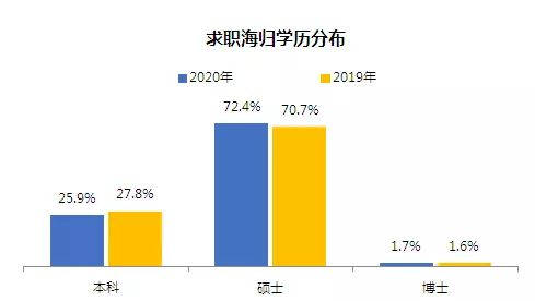 根据统计,在2020年求职的海归们,有72.4%是硕士学历,成为了海归求职大军的中坚力量。