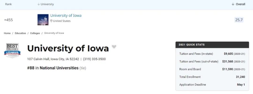 据小鲸了解到,爱荷华大学在2021年QS世界大学排名中排名全球455位,同时,它也是美国大学协会、十大联盟和公立常青藤成员。