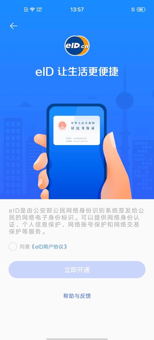 现在很多带有NFC功能的手机已经实现了对于eID的支持。eID全程为“electronic IDentity”,中文全程为公民网络电子身份标识。eID是以密码技术为基础、以智能安全芯片为载体、由“公安部公民网络身份识别系统”签发给公民的网络电子身份标识,能够在不泄露身份信息的前提下在线远程识别身份。